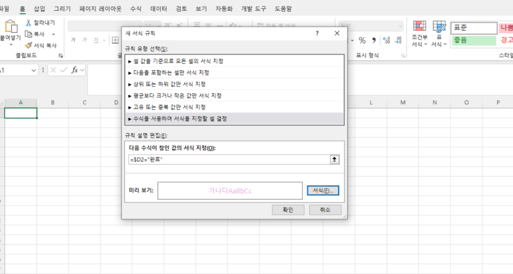그리고 상태가 D열에 있다고 가정하면 수식 입력란에 =$D2=”완료”라고 입력해주세요.