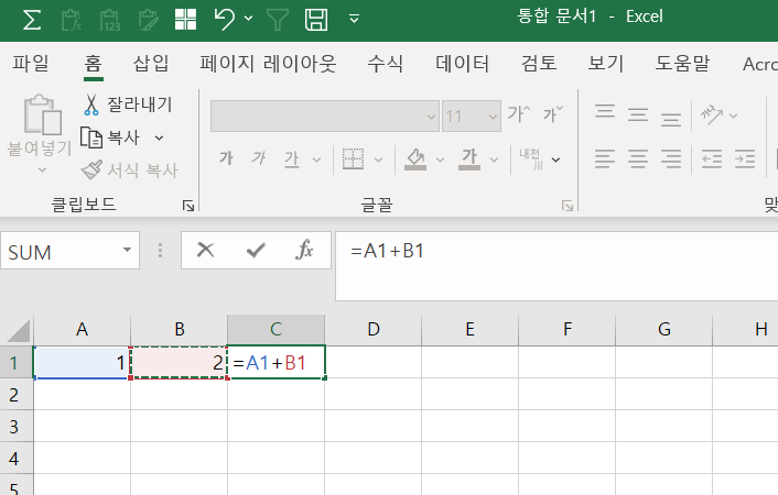 예를 들어 A1 셀과 B1 셀의 합을 구하고 싶다면 =A1+B1이라고 작성합니다.