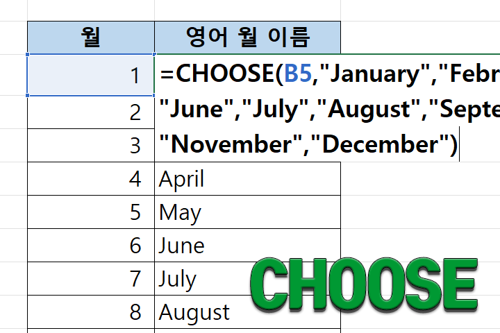 예를 들어, =CHOOSE(WEEKDAY(A1,2),”월”,”화”,”수”,”목”,”금”,”토”,”일”)