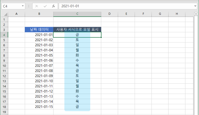 엑셀 언어 설정이나 시스템 지역 설정에 따라 요일 표기 방식이 달라질 수 있기 때문에, 여러 사람이 함께 사용하는 문서라면 함수 방식으로 요일을 통일하는 것이 바람직합니다.