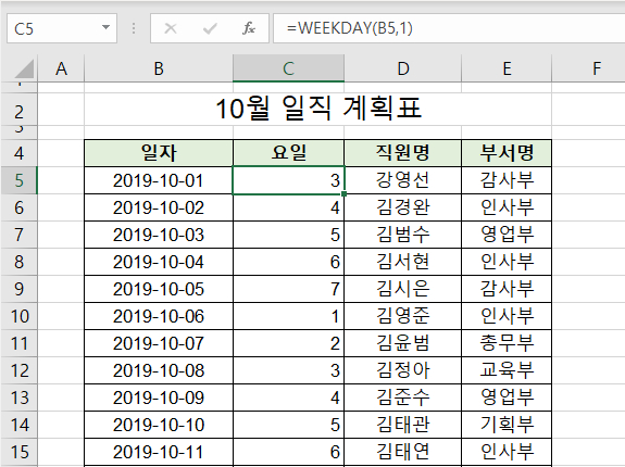 이때 활용되는 것이 바로 엑셀 요일 함수입니다.